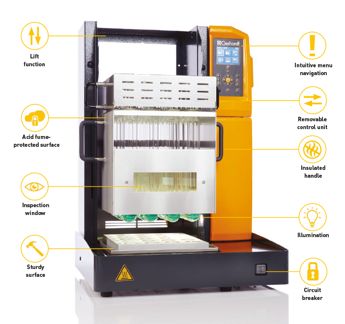 Flexível: Ajuste a quantidade de ácido de forma flexível ao seu tipo de amostra e processe até mesmo amostras gordurosas e não homogéneas sem dificuldades. As amostras com elevada formação de espuma são mantidas sob controlo através da regulação do aquecimento.